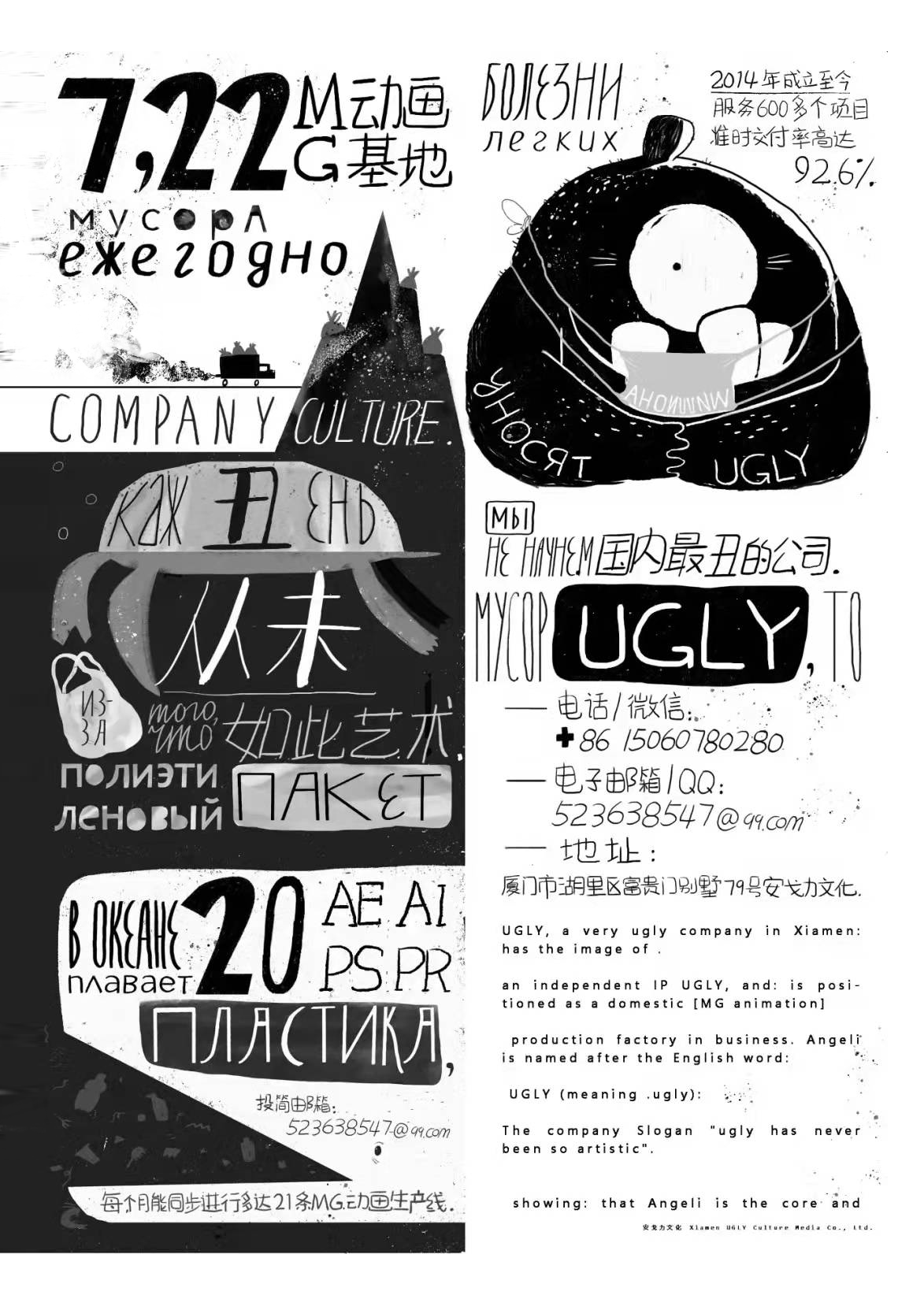 中国蕞丑的一家MG动画公司——(UGLY),专门服务国内广告同行、代理方、4A、甲方、乙方、丙方或丁方公司。在合作过程中以耿直、宅心仁厚的特点深受合作伙伴的热捧及引荐,迅速在业界打开名声。