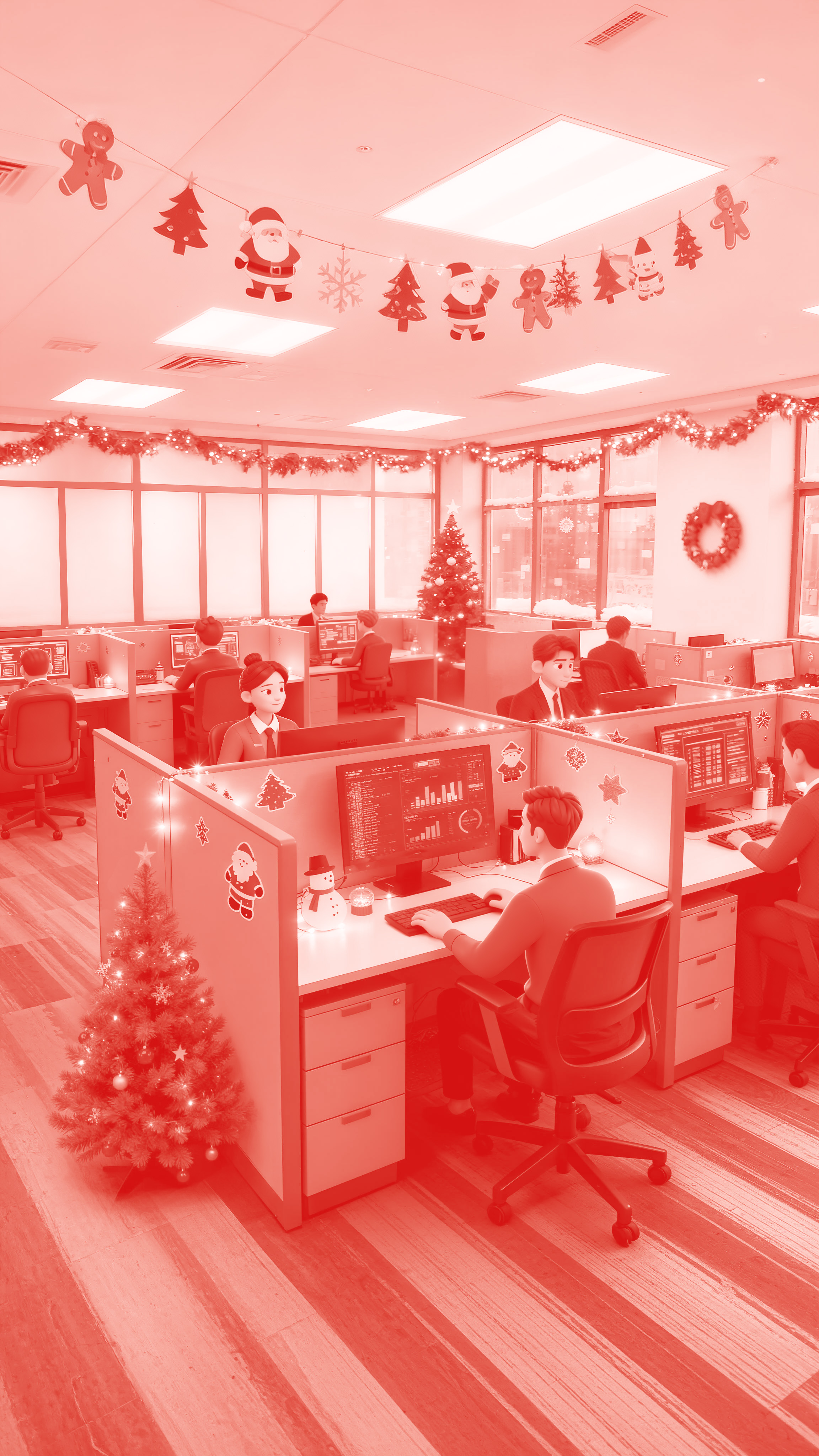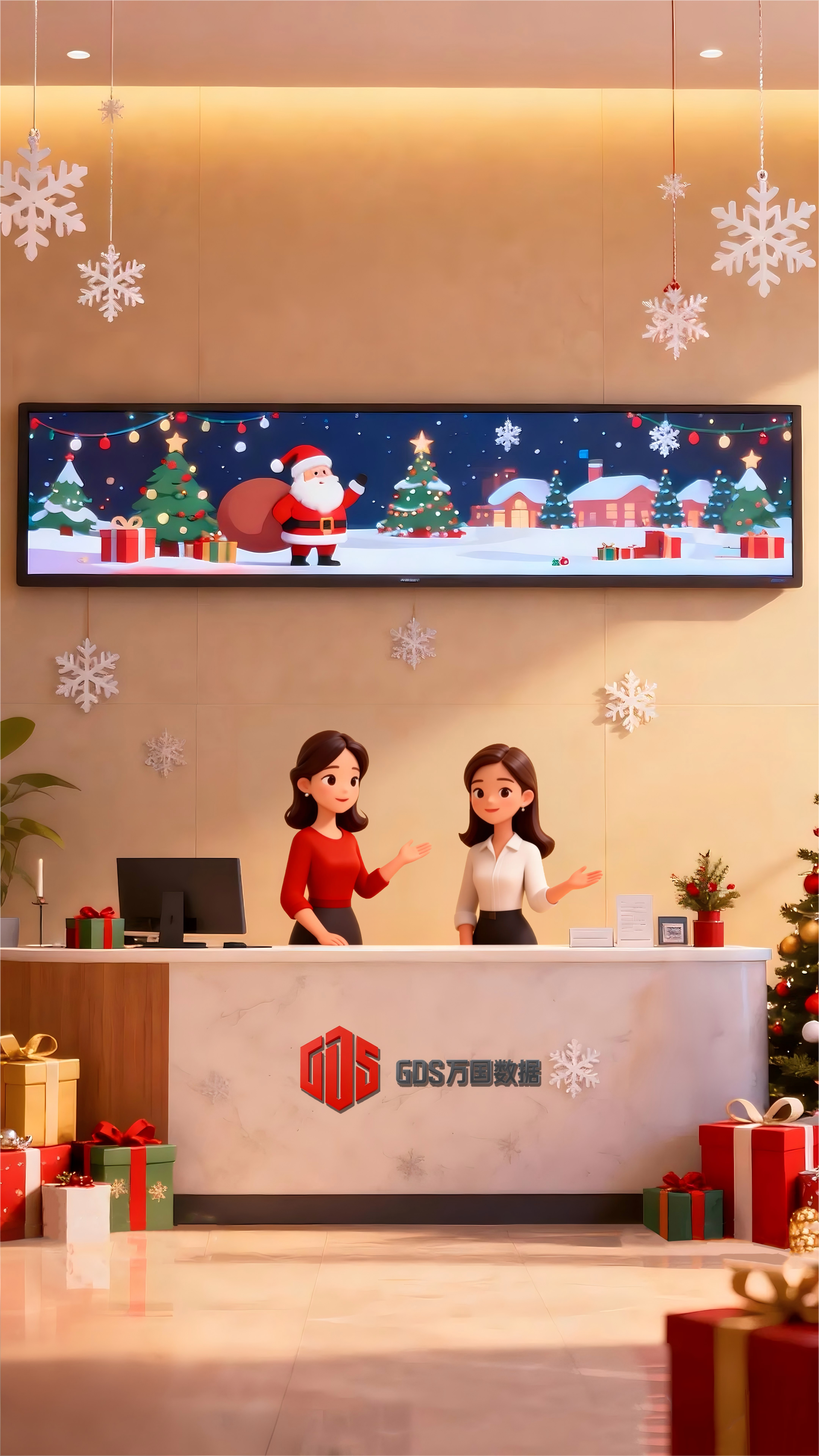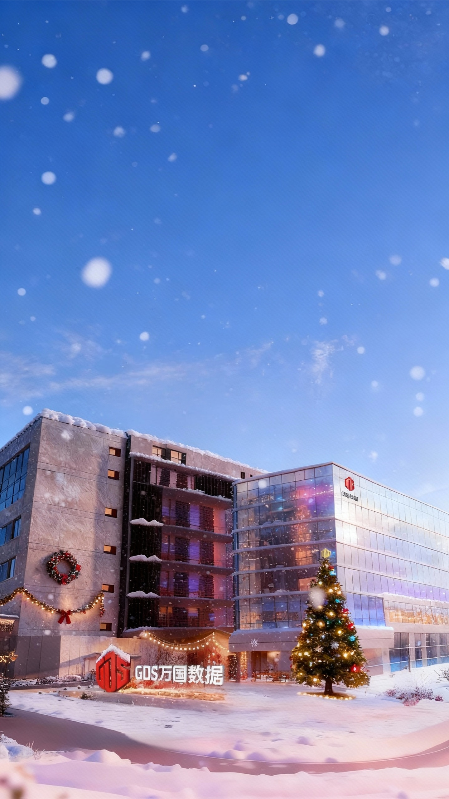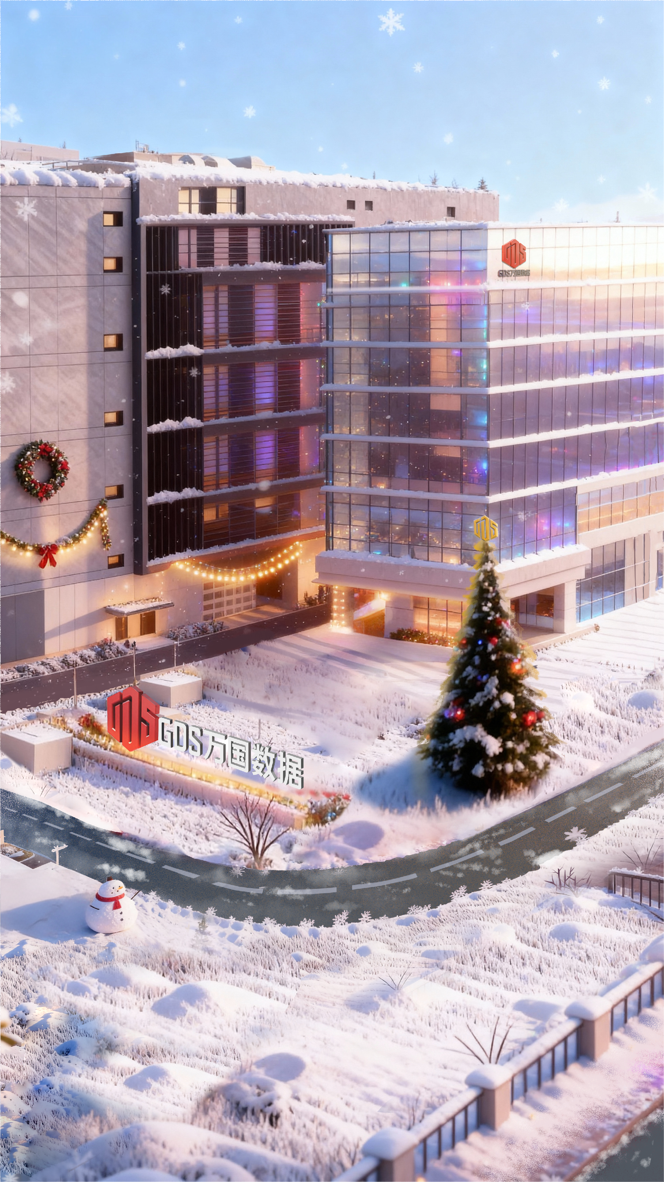 The entire short film is shot from the perspective of a drone in one continuous take, starting in the clear winter sunlight. At the beginning, the GDS building is covered with a thin layer of snow, and the blue sky outlines its sharp contours. The camera then glides smoothly into the lobby, where colorful lights are twinkling, and the Santa Claus on the screen waves to greet. The receptionist smiles warmly. The camera then turns and glides through the corridor, where Christmas posters and gingerbread man decorations sway gently in the breeze, and green plants and small trees add a touch of warmth. It then moves to the office area, where mini Christmas stockings are hung on workstations, and the small trees on the desks emit a soft glow. Colleagues are as focused as ever. The camera then turns to the monitoring center, where engineers are sitting around a round table, and data streams are quietly flickering. It then moves to the server room shown on the screen, and continues to move forward. Suddenly, a door opens wide, and outside is an endless snowfield, with sunlight pouring in. Finally, the camera pulls back, and the Christmas tree in front of the main building shines brightly, with snowflakes gently falling, capturing this Christmas day when technology and companionship coexist.