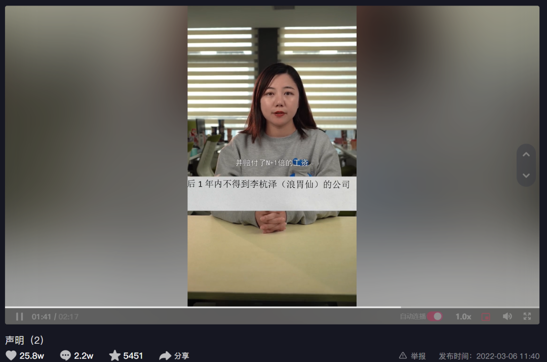 账号归属权之外,此次游絮和“浪胃仙”的另一个争议,是出走团队的竞业限制问题。在游絮看来,她已经支付了“n+1”的赔偿,且对员工的解约条款中明确做了竞业限制,尔后却在“浪胃仙”的视频里看到了他们的身影。而“浪胃仙”则认为她无权对开除的员工做竞业限制。