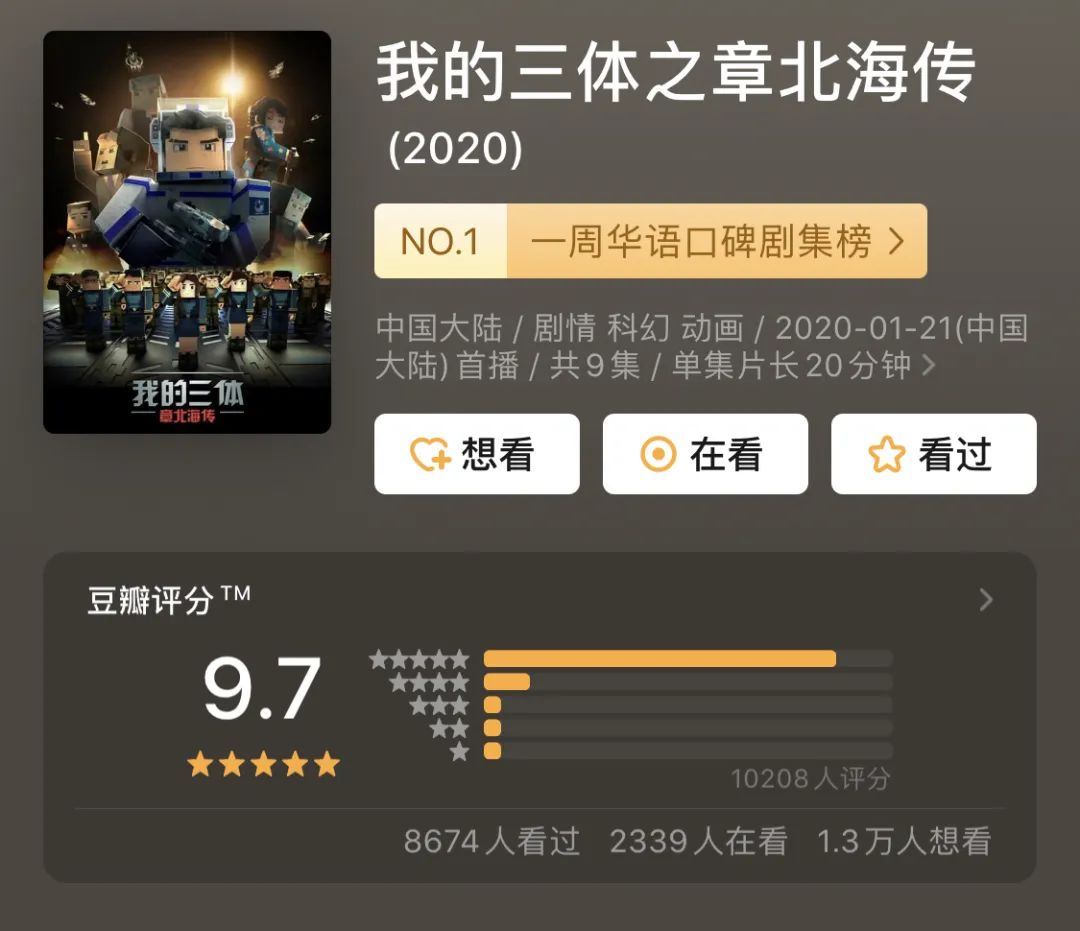 1月21日,9集动画科幻剧《我的三体之章北海传》在B站上线,豆瓣评分9.7,超过八成的观众打出五星。而B站直接给出了9.9的高分。要知道,目前B站的国漫榜单中,只有5部作品达到了9.9的分数,分别是《我的三体之章北海传》《我的三体之罗辑传》《罗小黑战记》《罗小黑战记电影版》《虹猫蓝兔七侠传》,其中《我的三体》系列就占据两席。