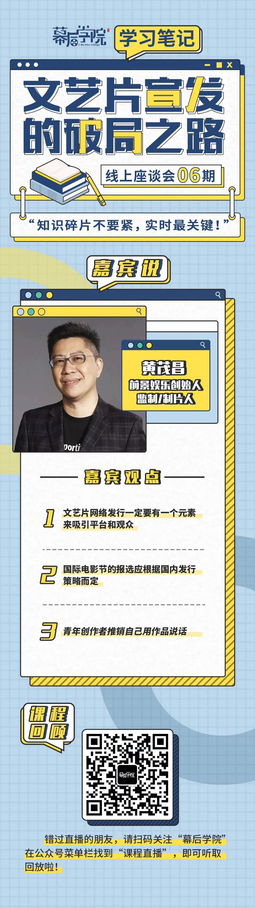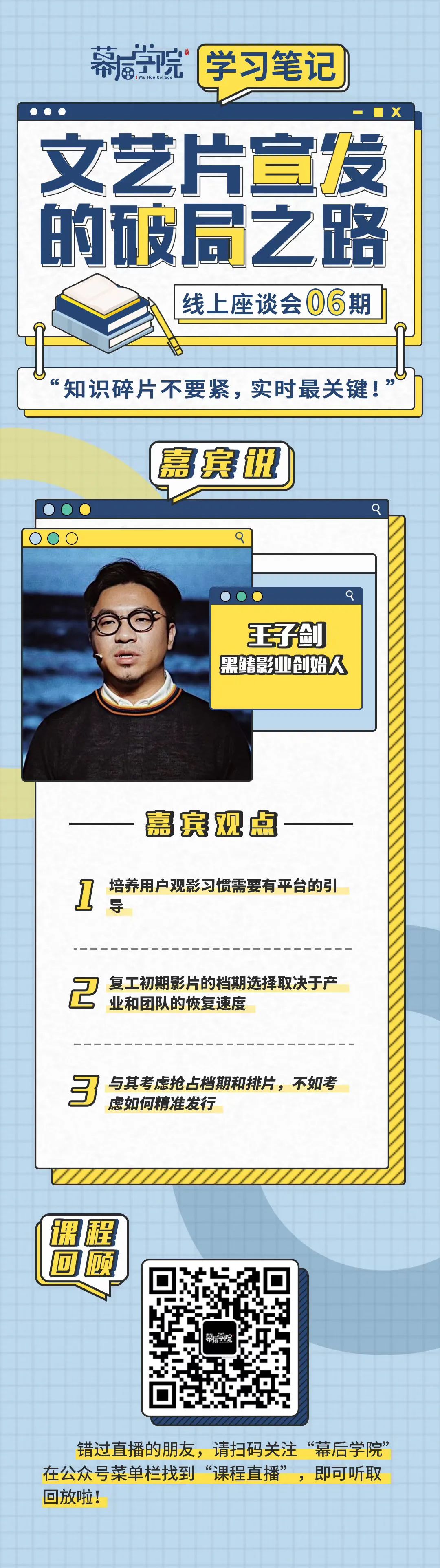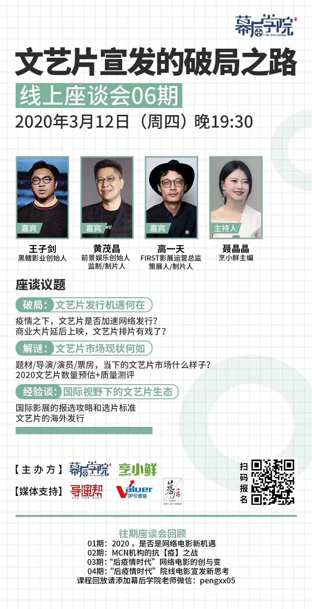 为此,我们联合幕后学院,于3月12日推出主题为“文艺片宣发的破局之路”的线上座谈会,对话嘉宾黑鳍影业创始人王子剑,前景娱乐创始人黄茂昌,和FIRST影展运营总监高一天。