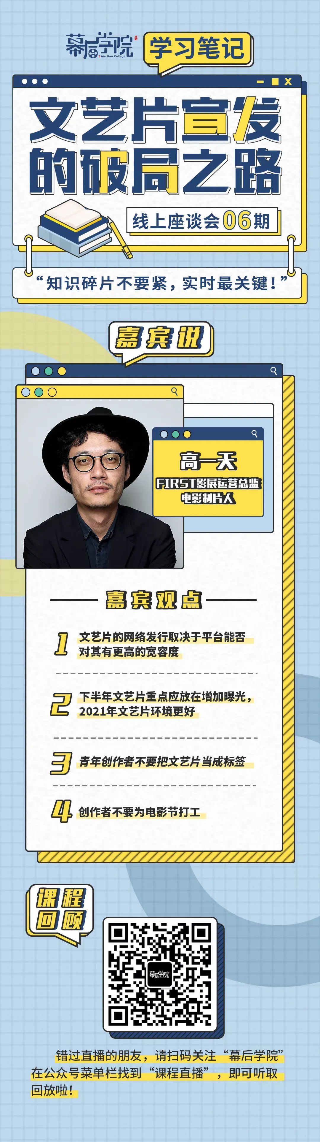 三位嘉宾就疫情下的情况,从破局、解谜、经验三个方面对文艺片长期以来的宣发困境,以及参与国外影节的方法论展开讨论。希望通过这两个小时的分享与建议,可以带给从业人员一些启迪和收获,为文艺片未来的破局之路做足准备。
