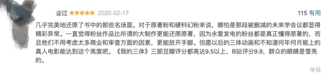 在《三体》电影不断跳票、电视剧改编遥遥无期的情况下,甚至有评论认为,因为对原著的了解,「用爱发电」的饭制或许比官方的大制作更能还原大IP的故事与精髓。