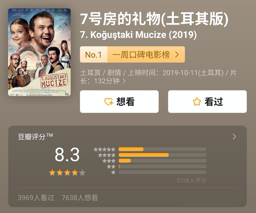 没有电影院的日子里,对于内地观众而言大部分电影都只能通过线上观看,而在近日,一部名为《7号房的礼物》就在各大电影网站和社交平台刷屏。不过,刷屏的并不是观众所熟知的韩国版《7号房的礼物》,而是一部出自土耳其的翻拍电影。在豆瓣网站上,这部《7号房的礼物》连续多周霸榜,8.3分的评价尽管不如韩国原版,但却仍不失为一部口碑佳作。