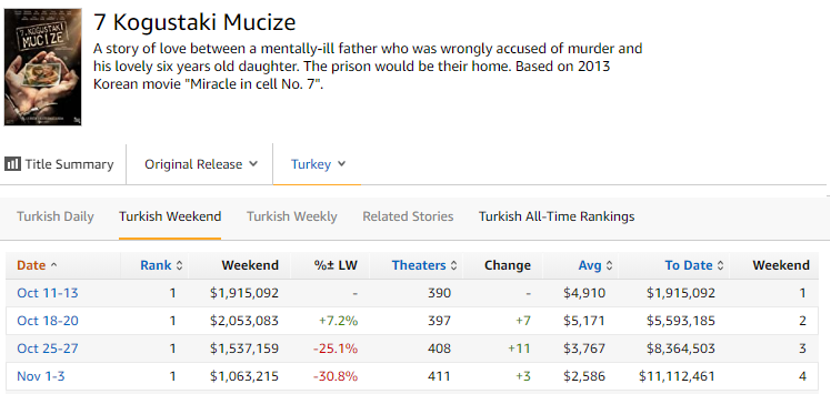 和韩国版上映后所引起的观影浪潮类似,在去年10月于本土正式上映后,这部土耳其版《7号房的礼物》迅速登上了票房榜前列,首周即收获了近200万美元的票房,位列当周票房榜冠军的位置。而在其后的一个月时间里,影片更多次蝉联了本土票房榜冠军,且连续10周均位列土耳其本土票房榜前十的位置,从影片所取得的口碑和商业成绩来看,土耳其版的《7号房的礼物》可以说丝毫不亚于原版。