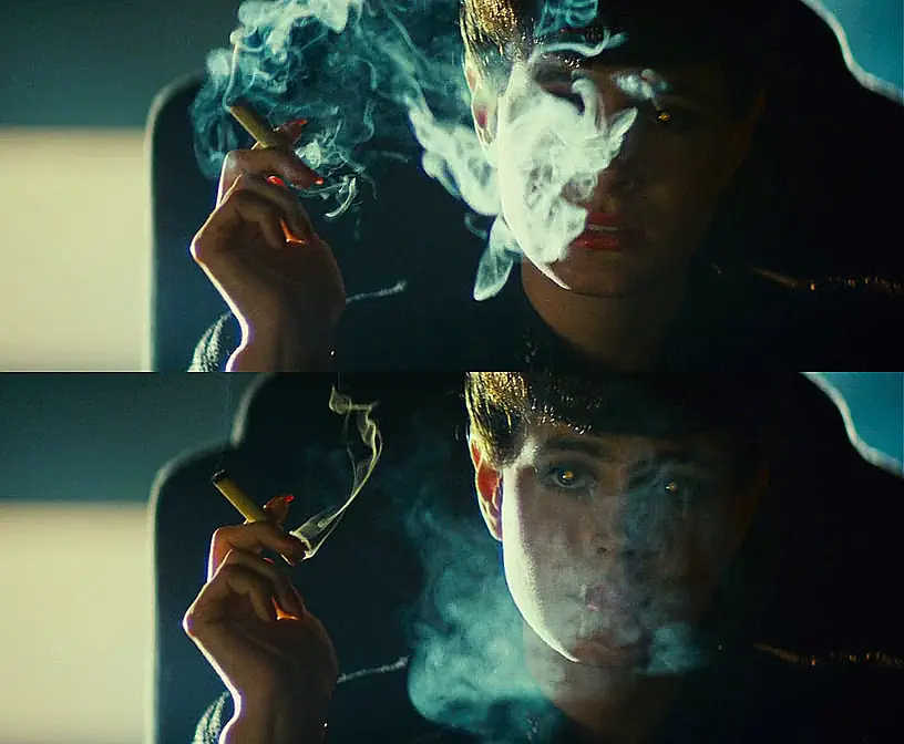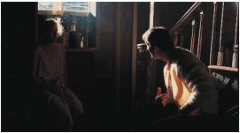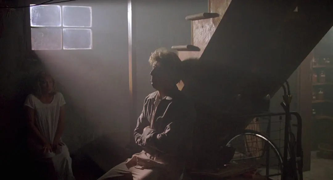 许多人也许会将杰夫·克罗嫩韦斯的黑暗风格与其早期为芬奇担任操作员,或是跟随达吕斯·康第拍摄《七宗罪》这样的经历联系在一起。事实上,这似乎是一项家族事业——在他两次赢得美国电影摄影师协会奖(ASC Awards)的父亲乔丹·克罗嫩韦斯(Jordan Cronenweth)的职业生涯中,“少即是多”是一条重要信条。“使你独树一帜的,不是你决定打亮什么,而是你决定不打亮什么。(It’s not what you light, it’s what you don’t light that separates you from everyone else.)”在杰夫·克罗嫩韦斯的描述中,这是父亲令他印象最为深刻的一句话。“年轻的摄影师总会犯这样的错误——过度照明。其实你可以用最简单的方式照明场景,仍然能得到很棒的结果。”在南加州大学的工作坊课程上,乔丹·克罗嫩韦思如是说。这场戏中,克罗嫩韦斯使用了一个巨大的背光,并在演员斜前方放置了一块聚乙烯板,将光反射到演员的脸上《银翼杀手》以低调、烟雾和霓虹著称的视觉风格影响了后来整整一代的摄影师。而除了最为著名的《银翼杀手》,为科波拉拍摄的《佩姬·休出嫁》(1986)同样也是乔丹·克罗嫩韦斯为人所熟知的代表作,这部作品曾为他带来美国摄影工会奖和奥斯卡金像奖两项大奖。在工作坊课程上,克罗嫩韦斯带领学生们一同回顾了他如何只用一盏灯得到片中地下室一场戏的杰出效果。这部电影是《回到未来》(Back to Future,1985)和《魔镜之旅》(Through the Looking Glass,1976)的混合体。影片情节是:婚姻不幸的女主角佩姬·休,在毕业 25 年后参加高中同学聚会;在聚会上,她兴奋得昏了过去,醒来后发现自己穿越到了 60 年代,重新回到 18 岁。命运给了她重头来过的机会,重温叛逆青春之后,她和丈夫也重温了鸳梦。工作坊要重现的这个场景,是重返青春的佩姬·休偷跑到父母家的地下室里抽烟。对她种种异常举动感到费解的男朋友,也跟着她来到地下室,想当面问个清楚。科波拉在拍摄佩姬·休娘家场景时大部分用的是实景,是在真正的房屋里拍摄的。这就给摄影师带来了一个棘手的问题,场地太狭小,灯光设备施展不开。克罗嫩韦思用一个简单的办法解决了这个问题,并在此次工作坊中重演了整个过程。“单一光源照明往往是不得已而为之的选择。我们当时拍摄的那个地下室只有一扇窗户,如果我在室内布光,就得藏很多小灯,不方便且效果很假,所以我想干脆只用一盏灯好了。窗户提供了解决的方案,至少值得一试。”克罗嫩韦思在窗外支起了一盏功率是 10K的钨丝灯,用来模拟月光。他在阴影处放烟,利用烟雾对光线的反射来提供一部分辅光,一块正对着窗户的小反光板用于提供更多的反光。整个场景最有趣的部分是大部分辅光都是演员自己提供的:男演员身上穿着黄色的毛衣,当他走向窗户边的女主角时,毛衣上的反光为女主角的脸部提供了额外的补光。演员凯特·霍尔和比尔·布雷迪重现了《佩姬·休出嫁》中的场景整个布光计划非常大胆。摄影机与窗户略呈夹角,窗外的 10K 灯从左至右照进室内,勾勒出楼梯等道具与布景的轮廓。烟雾提供了最低程度的辅光。女演员背对着窗户坐在床边,脸部位于暗区边缘,男演员与她相对而坐,灯光勾勒出他的侧面轮廓,画面很有张力。场景的亮区过曝,而其他的区域则几乎是全黑的。