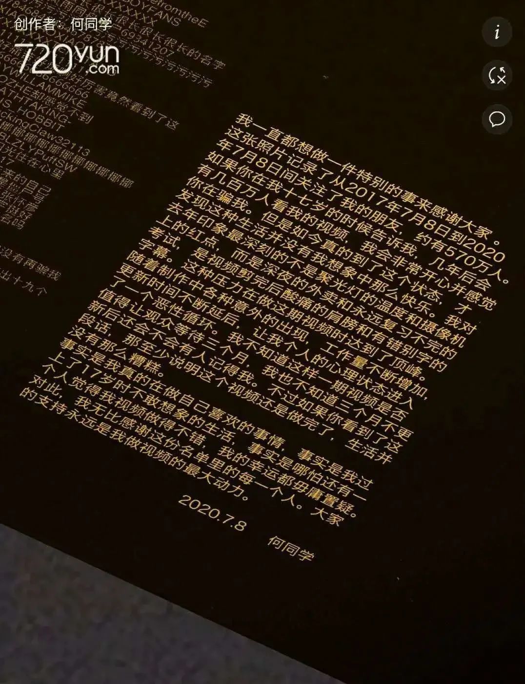 何同学做了一个尝试,做了一张自己与六百万粉丝ID的2000亿像素大合影,每个粉丝都能从这张高清全景照片中找到自己的名字。房间的空间在黑金配色卡纸的遮蔽下像一个微型宇宙,六百万个金色ID在不同角落里像星星一般熠熠生辉,这也太浪漫了吧。