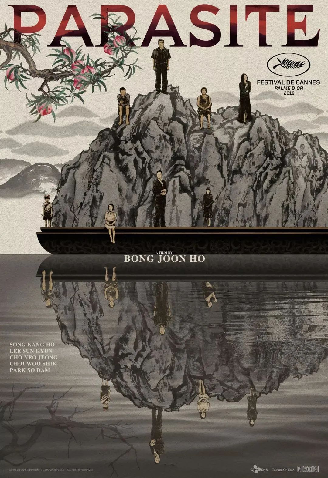 海报运用了水墨画风,在象征希望的石头上,穷人一家在山顶,富人在岸边,实际上水中的倒影才是真实的。富人凌驾于穷人之上,隐喻希望的石头终将毁灭。