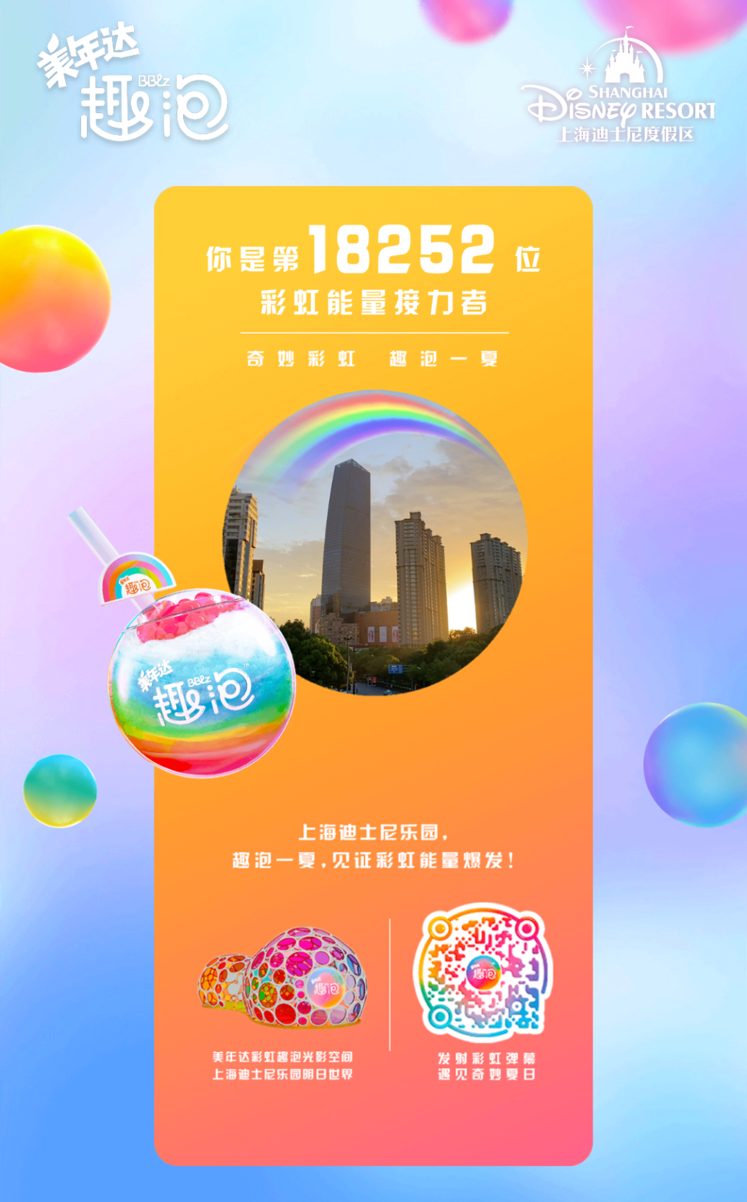 互动H5界面不仅增加了人们对线下打卡彩虹趣泡产品的期待和好奇心,线下线上双向导流,更是帮助用户从线上将自己充满希翼的积极态度主动传递给更多的人,触达广泛的人群,接力快乐和信心。