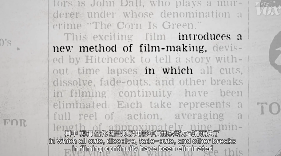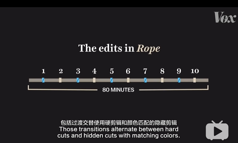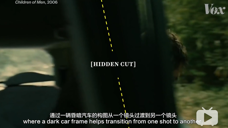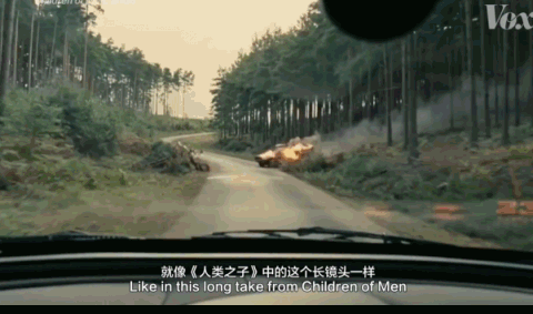两个小时拍成一个长镜头,这样的一镜到底的拍摄在调度和时机上无疑需要强大的掌控力,并且会让观众有更强的代入感,仿佛与片中的人物永远处在同一时间。《1917》在英国各地拍摄的场景之间不断转换,然后剪辑到一起,看起来像是连续的。当然这需要一些扩展的CGI作为剪辑辅助,但是这同样依赖于强大的剪辑技巧。1948年希区柯克的电影《夺魂索》可以说是一镜到底的鼻祖,有评论家之为一部“引入了一种新的电影制作方法”的电影。在这部电影中,剪辑、叠化、淡出等专场方式全部消失,从脚本的第一页就清晰的写上了拍摄计划:故事的动作要是连续的。因为《夺魂索》最初是基于一部戏剧,减少剪辑的痕迹能让电影看起来像实时演出一样。于是他们决定解决拍摄中最大的一个问题:胶卷不够长。当时的摄像机只能容纳一千英尺的35毫米胶片,大概能够拍摄10分钟。为了拍足够长的画面,他们要把拍摄时更换胶卷的痕迹尽可能变得不易察觉。相机移动到黑色的表面上,比如上边提到的西装外套。画面拍到西装的整个画面然后停下,更换胶卷开始新的拍摄,造成连续性的假象。80分钟的《夺魂索》有10次剪辑,包括过渡交替使用硬剪辑和颜色匹配的隐藏剪辑。这样的隐藏在现在看起来相当明显而且刻意,但这基本上与《奎迪》、《鸟人》《人类之子》、《蛇眼》中使用的技巧相同。但是如果摄像机横向移动,那么色块甚至不必填满整个画面,这就是技巧二,前景物体。将两个类似的场景放在一起,使物体在前景中通过,剪辑师可以将两个镜头拼接在一起,就像下边《人类之子》中的这个长镜头一样。事实上这是通过6个不同的镜头拍摄,但是通过一辆昏暗汽车的构图从一个镜头过渡到另一个镜头。但如果稍微加快摄像机的移动速度,还可以获得另一种隐藏剪辑的方式,即技巧三——运动模糊。在快速摇动的拍摄中,摄像机移动的过快使图像变得模糊。通过在动作达到最快点的时候把一个镜头切换到另一个镜头,就会使两个镜头看起来像一个。