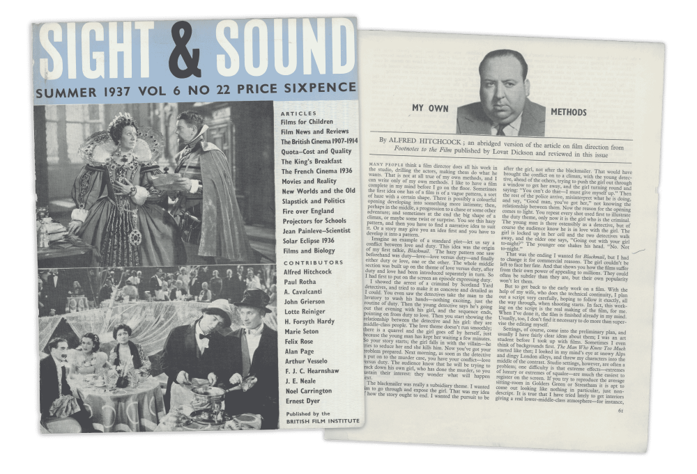 本文由悬疑大师阿尔弗雷德·希区柯克为《视与听》1937年夏季期所写,他剖析了他是如何将他的惊悚小说整合在一起的,并反思了大众电影的可能性和局限性。许多人认为电影导演在工作室里做他所有的工作,训练演员,让他们做他想做的事。对于我自己的方法,这完全不是真的,我只能编写自己的方法。我喜欢在我上场之前脑海里有一部完整的电影。有时人们对电影的第一印象是模糊的图案,一种带有某种形状的模糊。可能会有一个丰富多彩的开端,发展成更亲密的关系;然后也许中间是一段追逐或其他冒险的进展;有时在结尾有一个大形状的高潮,或者也许有一些转折或惊喜。你看到了这种模糊的模式,然后你必须找到一个适合它的叙事思路。或者一个故事可能会先给你一个想法,你必须把它发展成一个模式。△这篇文章最初发表在《视与听》1937年的夏季专题中