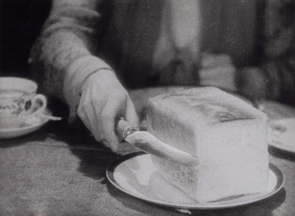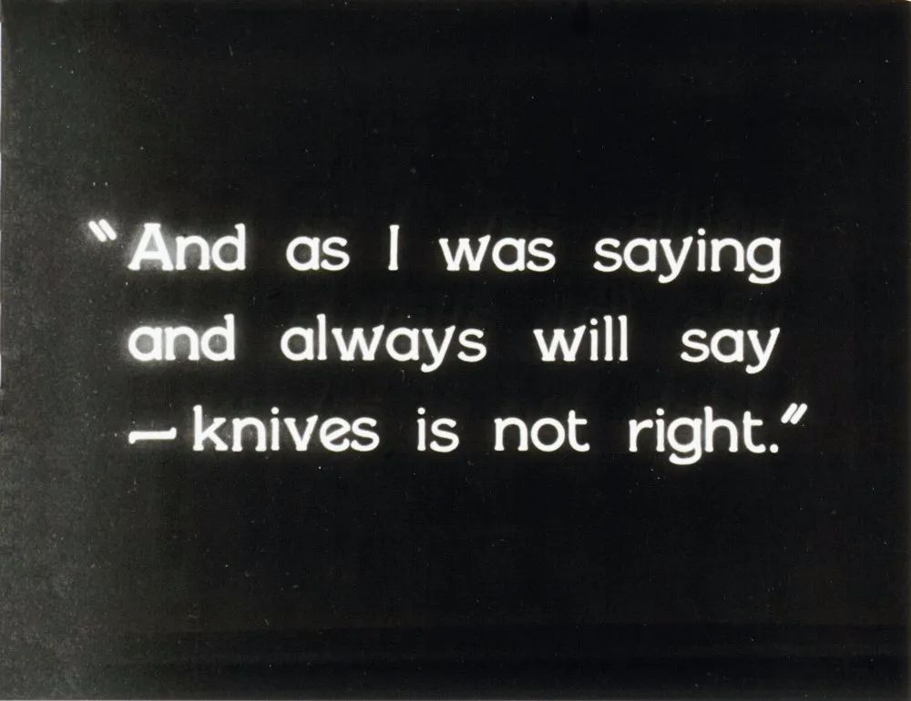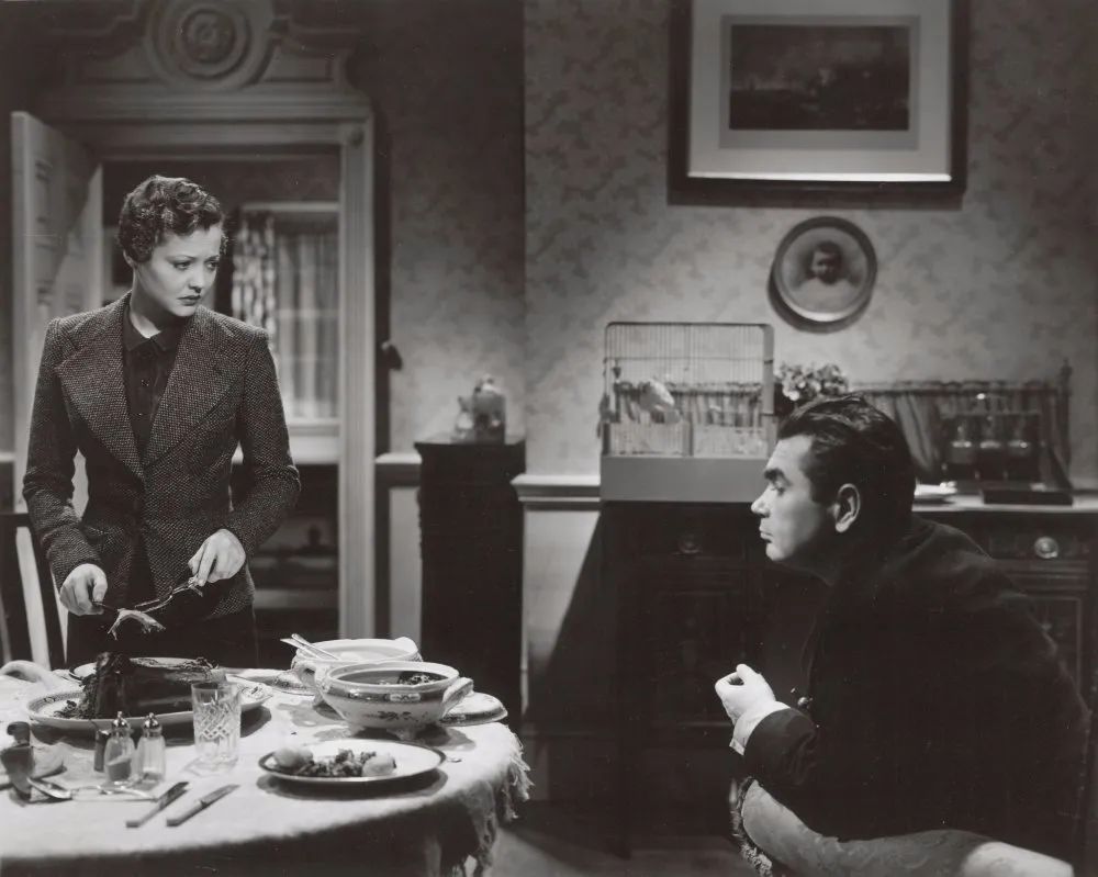 你可以看到我所说的破坏的一个例子。就在维洛克被杀之前,有一个场景完全由短片组成,单独拍摄。这个场景展示了维洛克是如何被杀死的——杀死他的想法是如何在西尔维娅·西德尼的脑海中浮现,并将自己与他们坐下来吃饭时使用的切肉刀联系在一起的。但观众的同情必须与西尔维娅·西德尼保持一致;我们必须清楚维洛克的死最终是一场意外。所以,当她在餐桌上服务时,你会看到她无意识地用切肉刀端菜,好像她的手在自动地握着刀。镜头从她的手切换到她的眼睛,然后又切换到她的手;然后回过头来,她突然意识到刀出了错。然后是正常的拍摄——那个人漫不经心地吃着东西;之后镜头又回到拿刀的手上。△《阴谋破坏》中的西尔维娅·西德尼和奥斯卡·霍莫尔卡在老式的表演方式中,西尔维娅必须通过夸张的面部表情向观众展示她的想法。但是现在的人们在现实生活中往往不会把自己的感情表现在脸上:所以电影的处理方式是通过她的手,通过她无意识地握刀,向观众展示她的思想。
