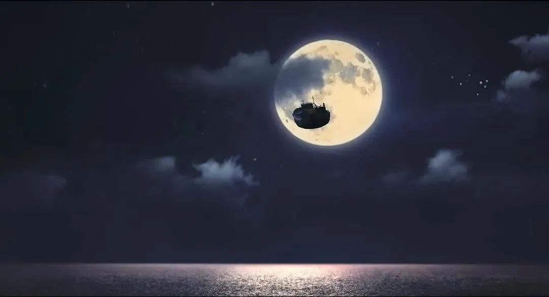 观众无法得知他们和小船如何在夜晚的潮汐中安全泅渡,因为唱到“飘呀飘向西天”的时候镜头已悄然穿过云层,定格在海面漂浮的一具尸体上。
