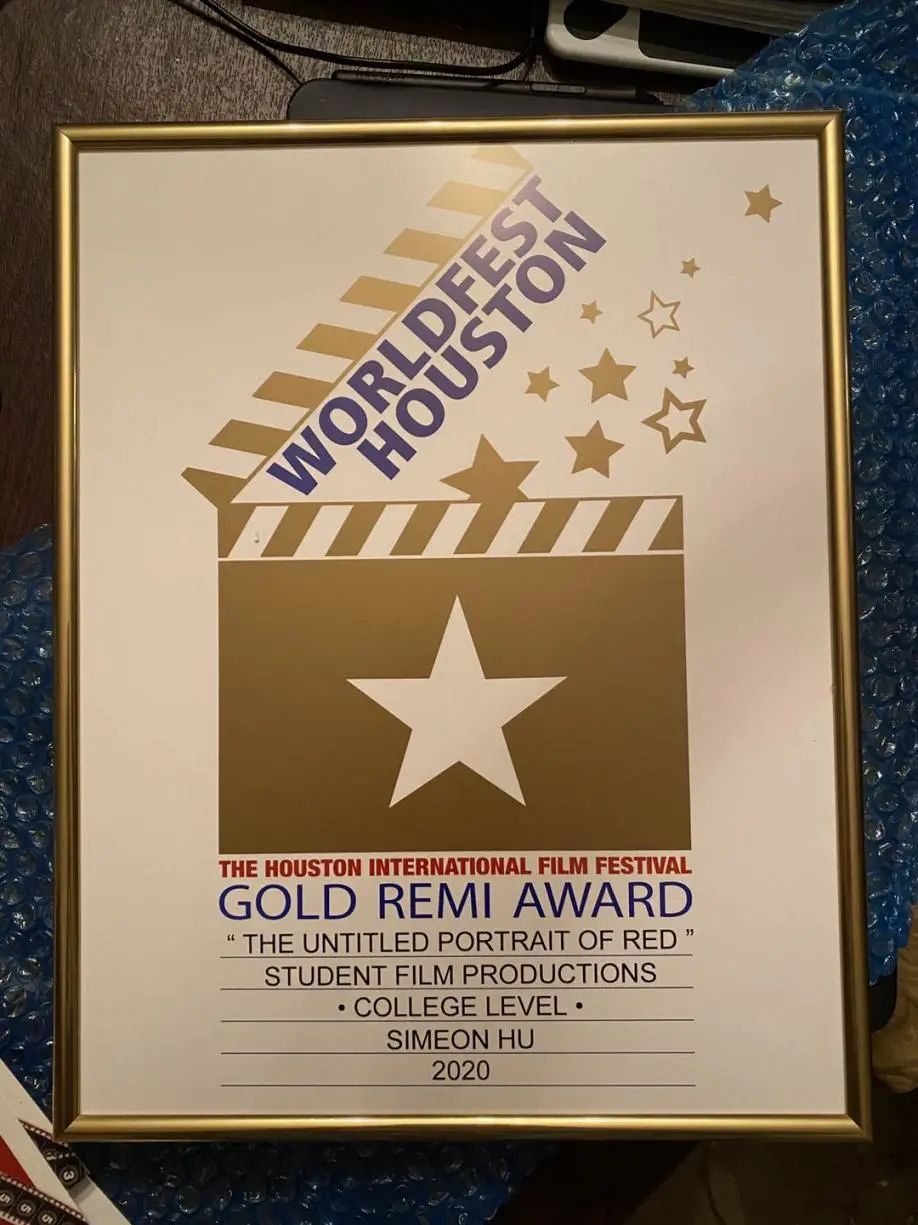 但就在此时,一则获奖通知传来,由他自编自导自剪的剧情短片《无题的红色肖像》,在第53届休斯敦国际电影节上摘得Gold Remi大学生电影金奖。