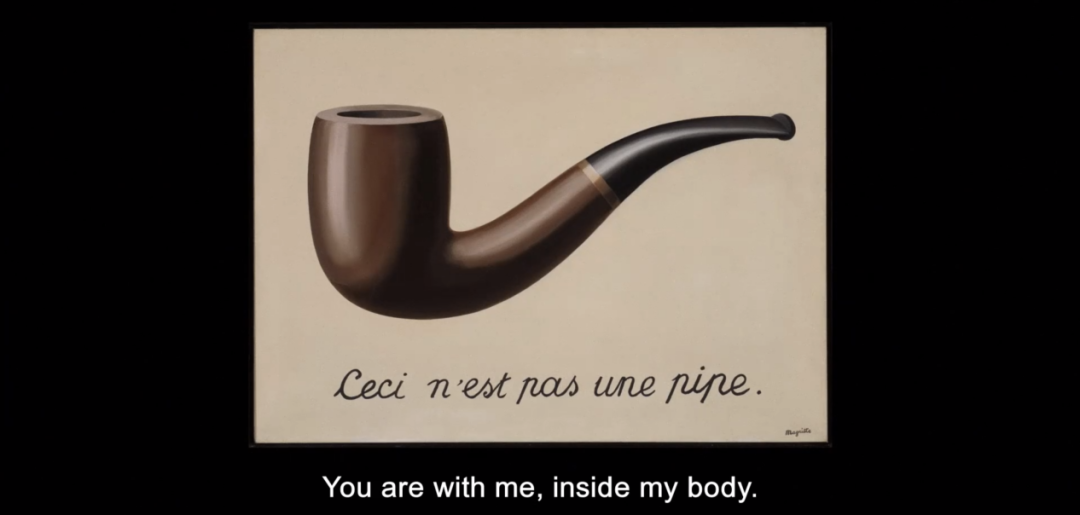 二是不同文化背景的青年,初恋的纯和美,用行为艺术,像征手法进行表现。我问子明:铁盒子里的烟斗、过去人的生活、现在和将来要串成历史?子明回:比利时画家马格利特有个名画叫《图像的反叛》,他画了一个逼真的烟斗,然后用法语写了一句,‘这不是一个烟斗’。它的意思是画中的烟斗代表着烟斗,但并不是一个真正的烟斗,我们看到的很多东西并不真正代表那个东西的本质,而是一种象征。”