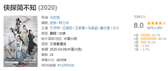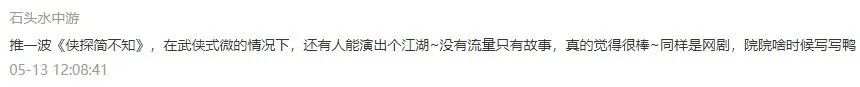 豆瓣上有网友说得很好,武侠没有死,它只是藏在每个人心底,等待被唤醒。《侠探简不知》很糊,很穷,本身破案剧情也并非全无破绽。可它唤醒了我心底曾经对江湖的向往,让我再度重温过去看武侠小说时悸动的心情。