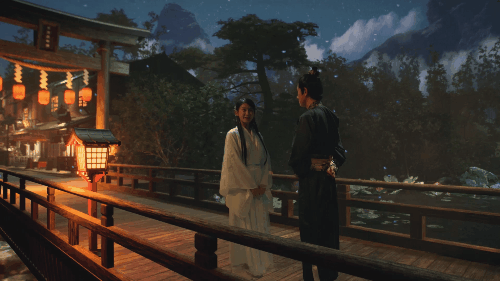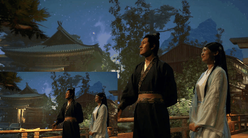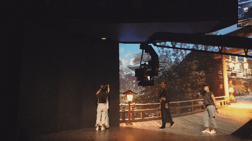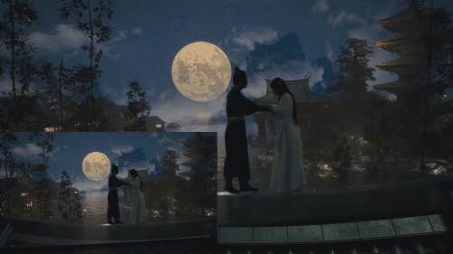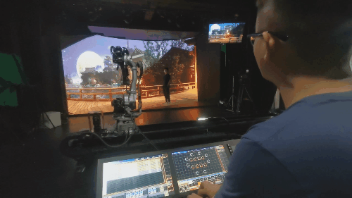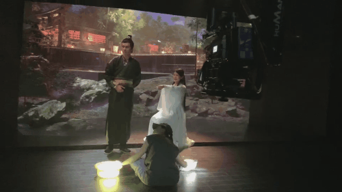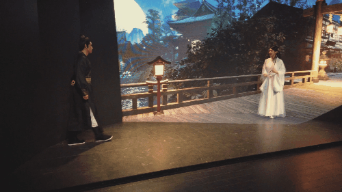实验短片《遇》片中,男女主人公,从桥上到水边,再到庙堂的屋顶远眺明月,都是在摄影棚的 V-Stage(虚拟舞台)中,将场景的大空间布局设置好之后,随即将演员置入其中,接下来的工作就是演员为导演所呈现的体验式的沉浸式表演了。那的确是一种相对自由的表演创作。
