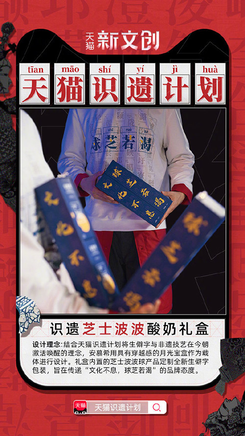 设计理念结合天猫识遗计划将生僻字与非遗技艺在今朝激活唤醒的理念,安慕希用具有穿越感的月光宝盒作为载体进行设计。礼盒内置的芝士波波球产品定制全新生僻字包装,旨在传递“文化不息,球芝若渴”的品牌态度。