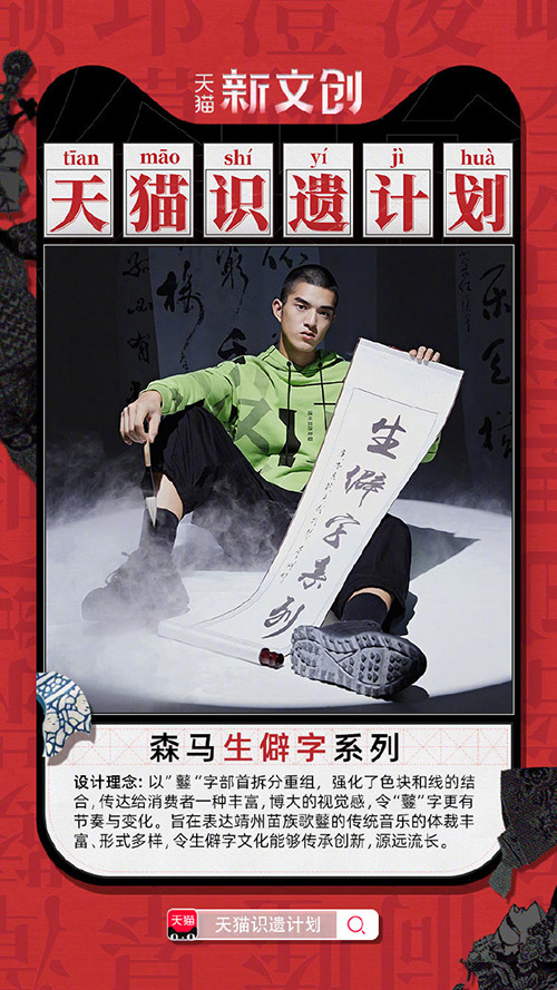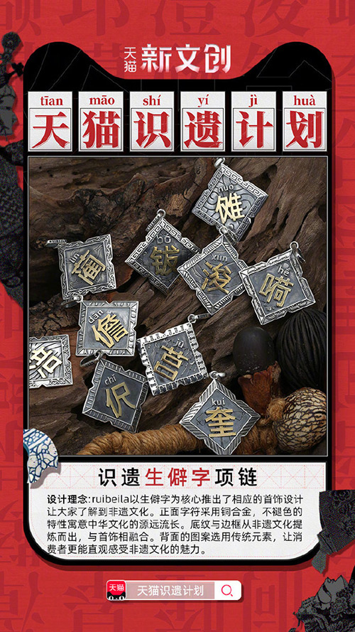 你知道每年有多少非物质文化遗产因为生僻字的原因正在慢慢消失吗?天猫新文创发起《天猫识遗计划》,联合众多品牌发起对生僻字非遗保护,将这些生僻字非遗技艺,用说唱、潮流单品等年轻化的形式再次包装,艺术化呈现给世人。非遗不生僻,从认识这些生僻字开始。