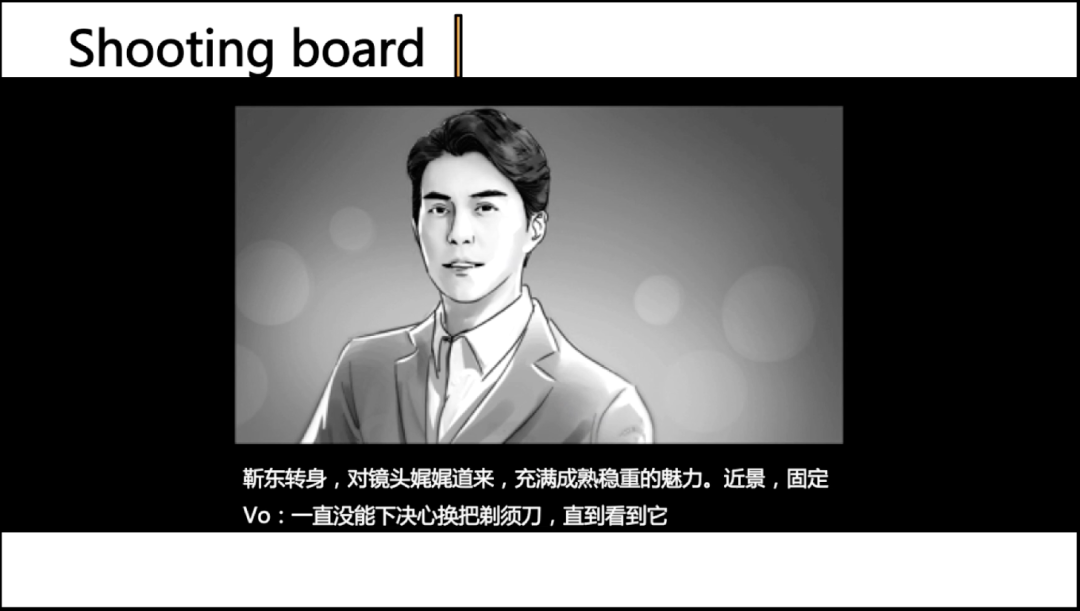 (这次的文章会深挖一下导演专业的垂直度。也同时保持我文章的一贯风格……愉快的阅读体验+最后来点业内的“小说”)言归正题,分镜脚本,又叫拍摄剧本。在专业广告组的拍摄日和颇具规模电影组的拍摄现场,大家翻阅的都是分镜脚本;聊的是如何实现分镜上的设计。主创之间有分歧时,判断和舍取标准也是分镜脚本。可以开句玩笑话——在拍摄日,我宁愿丢的是手机,也不是自己那份标注多重信息的分镜脚本~分镜脚本是拍摄现场的通关语言,是剧组创作和制作等一系列工作的指导纲领。更是导演必须亲自做的工作!(无人能替代导演出分镜。导演只能自己咬牙想破头~)。为何分镜的产出过程如此耗费脑细胞呢?且听我从分镜脚本的内容上说起……分镜脚本中的1个镜头,包含导演在创作层面的15项思考这15项包括:故事内容/表演内容/景别/构图/角度/高度/运镜/影调/概念/氛围/主要元素/剪辑/VO/字幕/音效。3.摄影景别————大全/全景/中景/近景/特写等。5.摄影机角度———正面角度/侧面角度/正侧角度/背面角度等7.摄影机运镜———固定/推/拉/摇/移/跟/升/降/手持等8.画面影调————明暗层次/虚实对比/色相明暗等把这15项都思考一遍后,导演用画稿+精简文字落实在分镜脚本中——这就是导演创作分镜中一个镜头的过程。如果分镜脚本设定有20cut(镜头),那就是说,导演需要自己在大脑中进行20遍这套流程。需要注意的是,后4项不一定出现在每个镜头里。但是,深思熟虑后决定不采用,和创作分镜时遗漏……是完全不同的两种情况。大家也许产生疑问……分镜脚本的每个镜头,不就是一张图+简短文字吗?能包含这么多项的思考吗?那接下来我们用两个案例,来看一下这15项如何浓缩(装在)分镜脚本中。+文字描述“靳东转身,对镜头娓娓道来,充满成熟的魅力”摄影景别————文字描述中的“近景”+画稿画出的近景(暗调背景并画出虚实关系。加光斑突出背景需要虚化)美术概念————画稿画出的概念上设计:在舞台上靳东的独白。后期vo—————文字描述中的“一直没能下决心换把剃须刀,直到看到它”看似简单的画面背后,有着导演复杂而全面的创作历程。通过这两个镜头可以感受到——分镜凝聚了导演的创作能力。(导演晓课堂——导演出分镜)