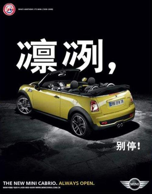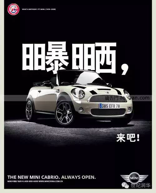 有删减偏旁的,就有增加偏旁的,mini这一组海报通过增加偏旁表达了敞篷版mini带来的各种真切体验——太阳的暴晒,高温的炙烤,寒风的凛冽,暴雨的淋漓……一切的体验都被×2放大,如此mini,谁不想体验一下?