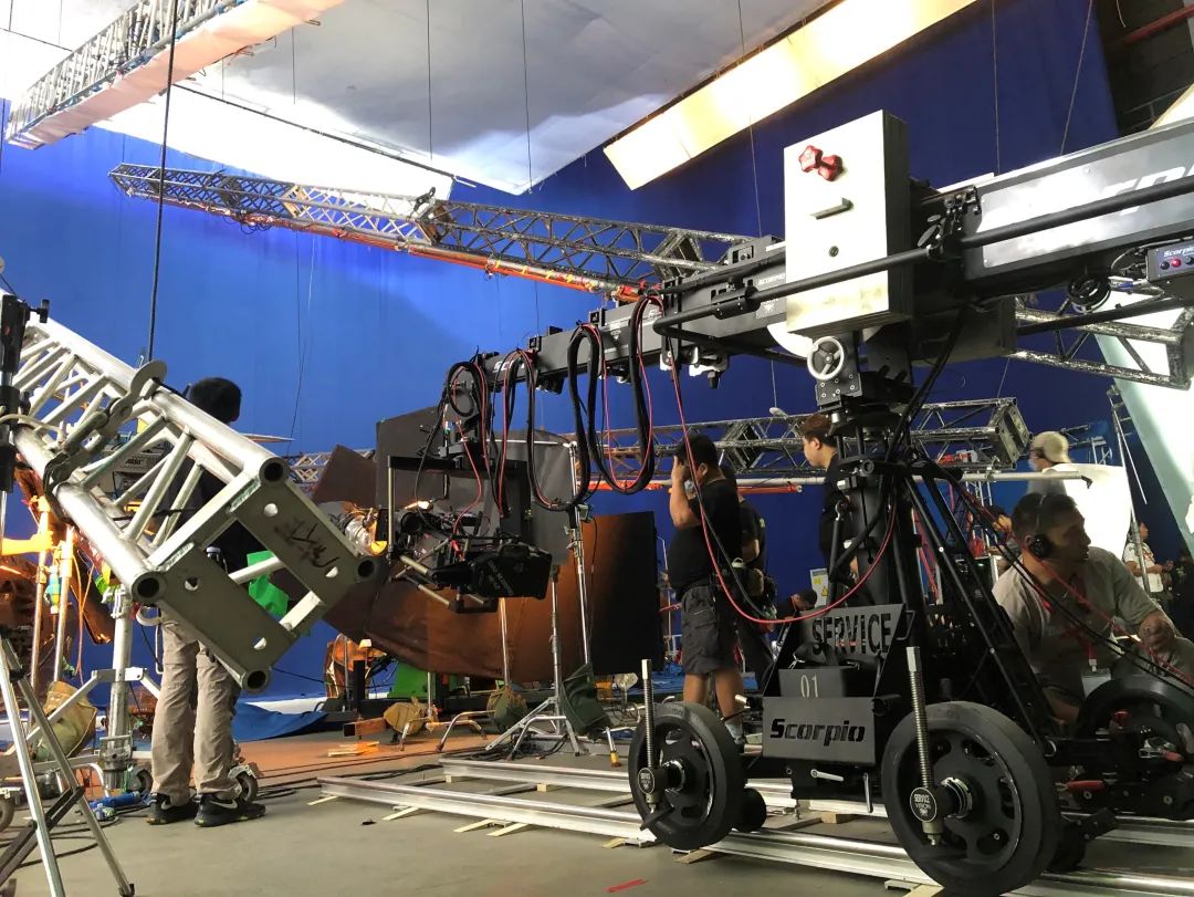 On the contrary, camera movement was not particularly complicated. I can only recall a complicated 360-degree rotating camera movement. In the beginning, the camera followed the plane from the tail, and then it moved to the side of the pilot, then rotating, and finally drilled into the cabin of the plane. At this time, the camera is shooting from a first-person perspective looking forward.World’s first Scorpio 17’, serial No. 001For our film we used the world's first Scorpio 17’ electronic telescopic crane. I was very impressed when I first saw it, and it was a great honor to be able to use the world's first Scorpio 17’. I have used many other models of Scorpio electronic telescopic cranes before, my feeling is that Scorpio cranes are very stable, very robust, and the load-bearing capacity is large. They are very reliable during filming, you feel safe and comfortable to use Scorpio cranes. With the track, except for some extremely high angles, almost all the common camera movements can be done with a Scorpio 17’. As long as I use an electronic telescopic crane, I use it with the track, this combination allows us to achieve very flexible camera movement.Scorpio 17’ crane on trackWhat do you think of the efficiency of shooting with Scorpio 17’?