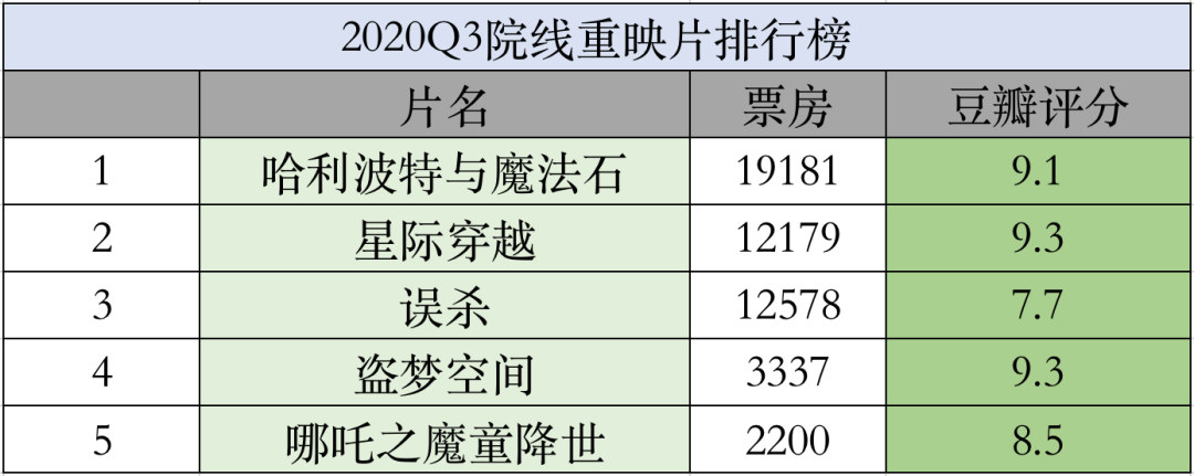 因为特殊的历史背景,Q3的电影榜单要从新片与重映片两个角度观察。