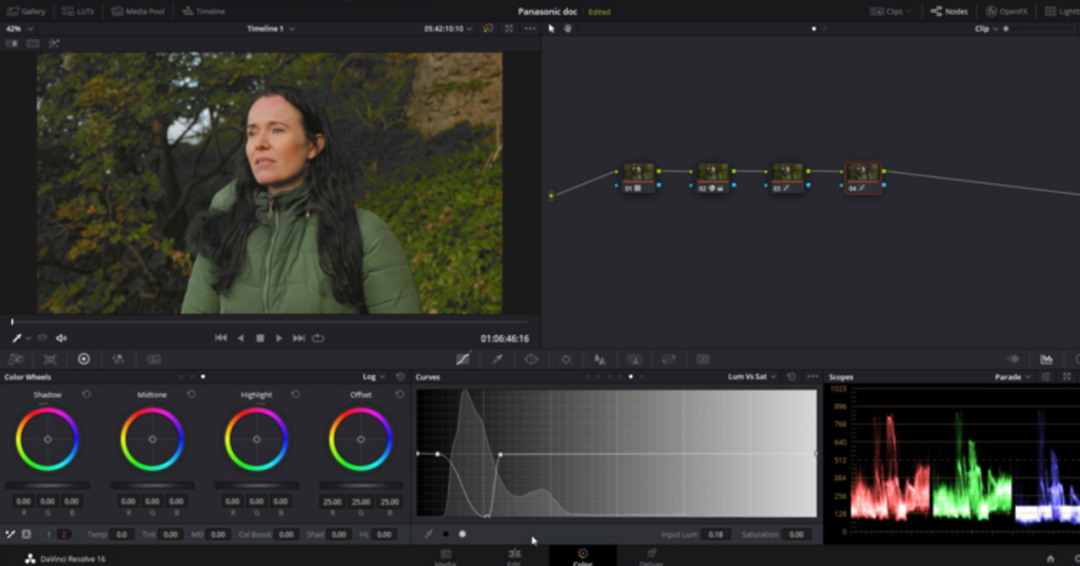 直方图中的信息直接表示查看器中的内容。在这个示例的镜头中,有大量的红绿色和蓝色,如曲线图所示。因此,如果要调整蓝色饱和度,可以在尖峰周围设置两个控制点,然后增加或减少该色调。或者,我们可以移至预览监视器上,然后会出现一个采集吸取工具。选择图像中的任何色相后,相应的控制点将出现在曲线图中,从而进行更精确的调整。我们可以在一条曲线上,在一个节点上全部增加绿色饱和度,同时降低蓝色饱和度。