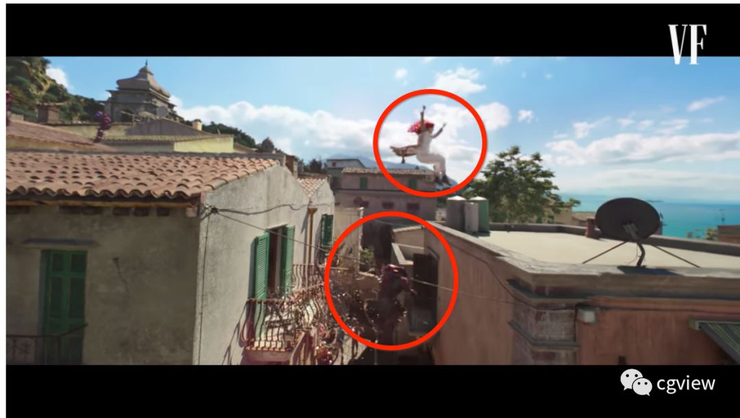 从视频00:36镜头从屋内摇出室外一直跟在Mera那部分开始,第一组特技演员负责屋顶上直线运动的跑位,当Mera转了90度继续跑的时候换成第二组特技演员,也就是在视频46s的时候,转角的地方放了个烟囱。第一组跑完躲在烟囱后面,换第二组。