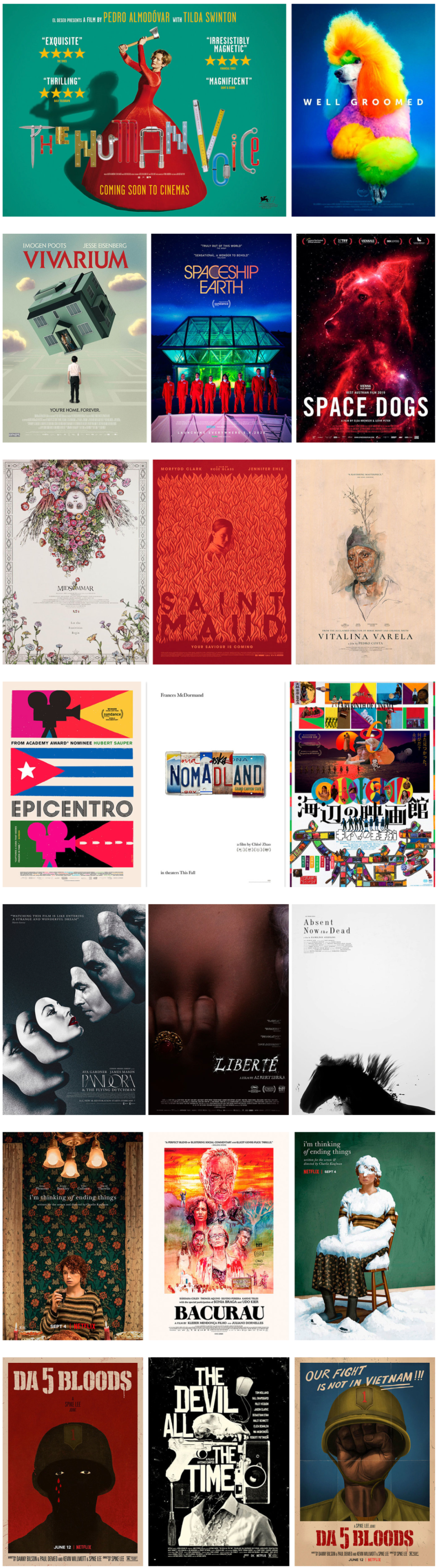 她在今年有很多出色的海报:斯派克·李的《誓血五人组》(Da 5 Bloods,2020)、查理·考夫曼的《我想结束这一切》(I'm Thinking of Ending Things)的另类海报,甚至还有《占有者》(Possessor)的另类设计。