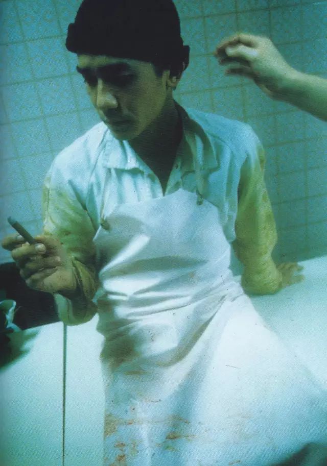 Tony要演屠房工人,他喝得烂醉。摄制队吃酸奶打底,使劲地擦洗双手。