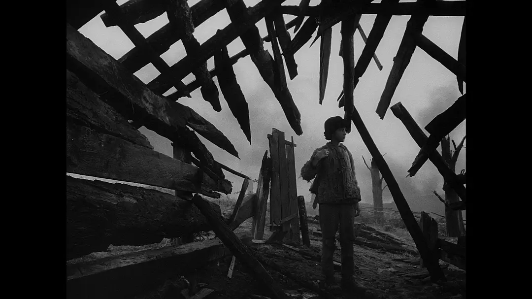 在画面内的运动画面不限于矩形形状。任何形状或形式的框架都可以用作拍摄中的辅助构图,只要它以某种方式围绕着主体就可以。安德烈·塔尔科夫斯基和他的摄影师瓦迪姆·尤索夫,在《伊万的童年》中则使用了“刺”状的框架构图取景。