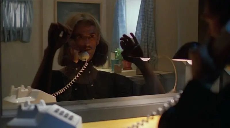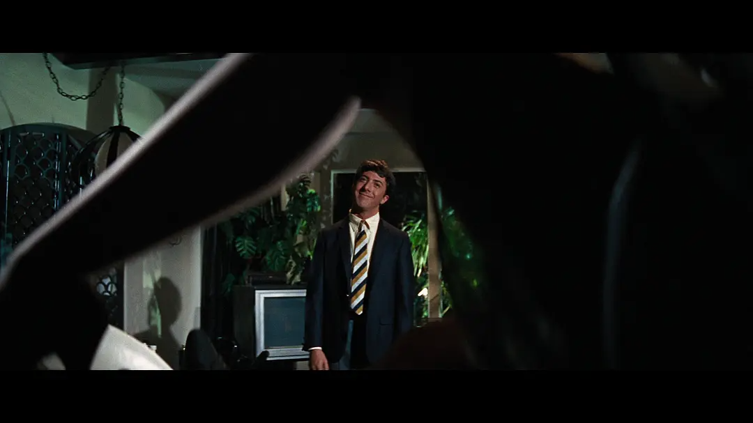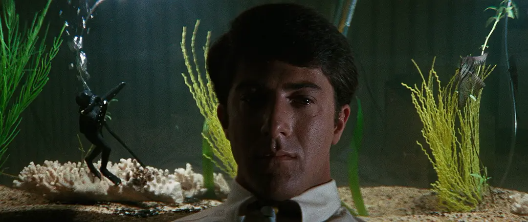 不同的寓意总是会出现在你对构图的选择上。如果在框架式构图中,画面中的主体与框架看起来比较紧而且受约束,这可能会使画面产生幽闭恐惧的压迫感。在上面图中,我们看到Ben(由达斯亭霍夫曼扮演)坐在鱼缸前。大学毕业后,他试图弄清楚自己的生活到底该怎么办。注意在鱼缸中里的海藻如何在Ben的头部周围形成一个封闭的框架。这种海藻可以看作是Ben焦虑的隐喻。鱼缸中的小人用鱼叉在Ben的头上增加了一个特殊的滑稽感。Ben的父亲入画,头部遮住了浴缸中的小人,并在画面内创建了第二个更加压迫的框架。