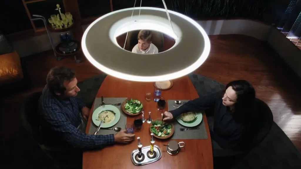 《人工智能》圆形灯具暗示小机器人与父母吃饭时的隔阂感,由海利·乔·奥斯蒙特扮演。后来在电影中,画面内的圆形框架被用来作为一个暗示的机会,达到突出角色目的的效果。