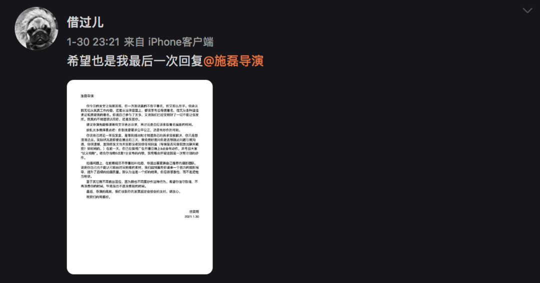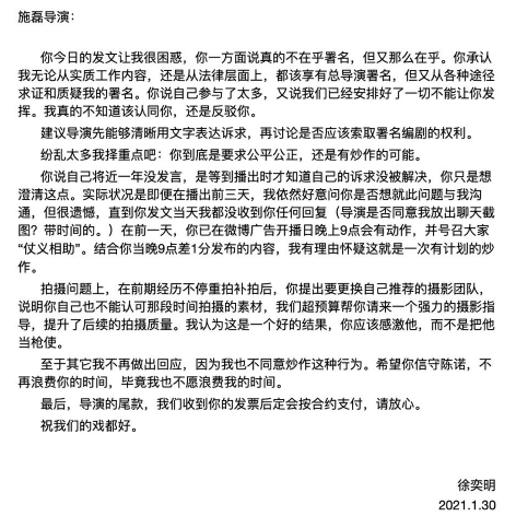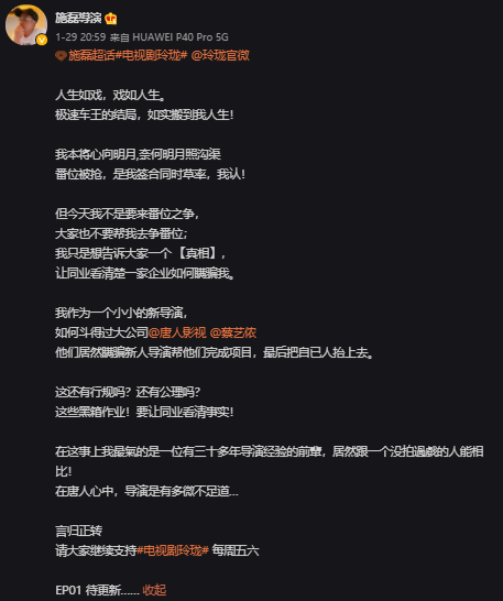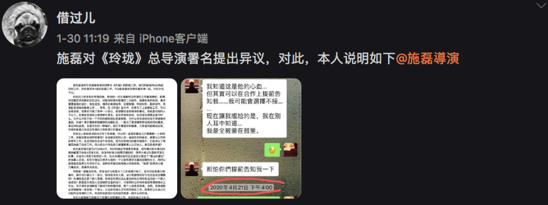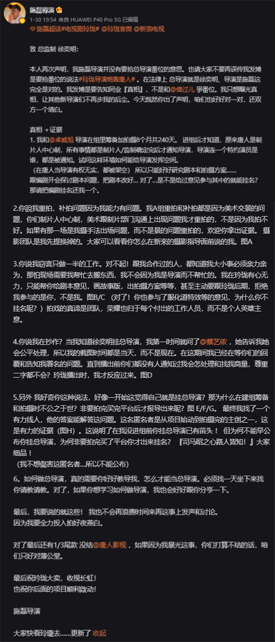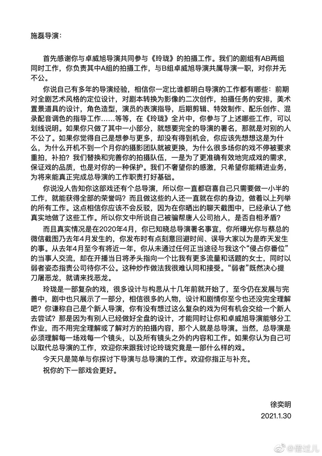 1月29日,《玲珑》开播当晚,导演施磊发微博斥责片方,称自己“番位被抢”,拍摄完成之后才知道总导演另有其人。随后,《玲珑》总导演徐奕明发文回应,质疑施磊业务能力问题,称其为借时机炒作。《玲珑》的导演署名争议在行业内算个例,这其中的主要争议点在于导演和总导演的职责划分不清。经娱理工作室调查发现,行业内真正的挂名乱象和陷阱更多集中于监制、策划,甚至已经有人开始以此行骗。微博发出之后,娱理工作室联系到导演施磊。据他表示,当年是经圈内朋友介绍认识了唐人影视总裁蔡艺侬,并参与到了《玲珑》项目中,“当时他们给我介绍的是编剧徐奕明,监制也是他。”签约时,施磊签署了导演、联合导演两份合同。