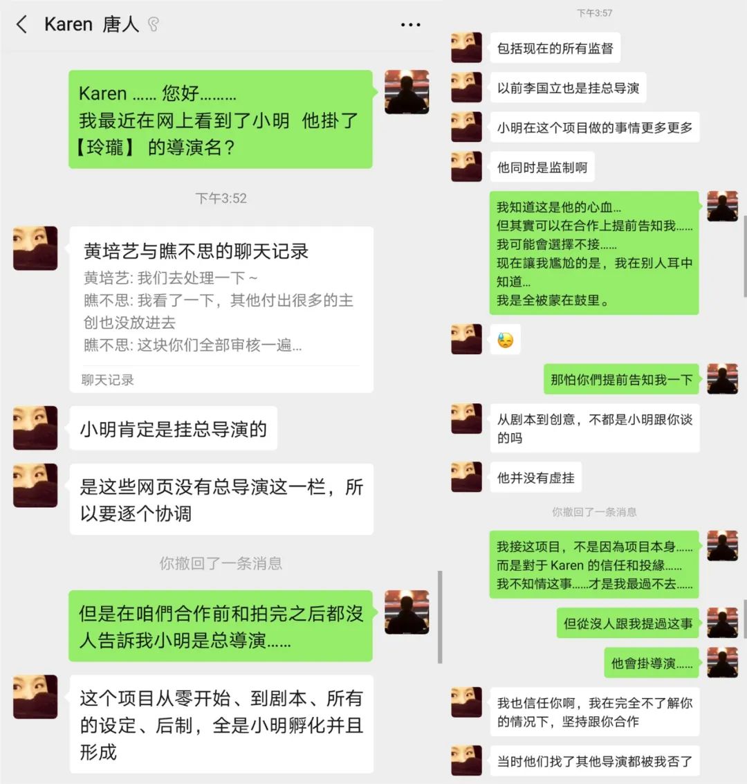 通过《玲珑》播出成片片头信息可以看到,编剧署名在出品人之后,徐奕明为编剧第一顺位,导演施磊、卓威旭的署名位置在总制片人、总导演之前,处在倒数第三位,而公认最重要的、也就是片头最后一个署名位置则属于总导演徐奕明。但是在该项目启动之初的演员Casting信息和剧组通讯录中,徐奕明的署名除编剧之外,还有一个则是该剧的总监制,剧组此前的公开信息也并未体现《玲珑》有总导演的职位和署名。可是,《玲珑》的片头信息却显示徐奕明的署名从总监制变成了总导演。导演施磊提供了聊天记录,证明《玲珑》现场的拍摄对接工作是他本人在做决定并完成的,而且这些工作并不需要向徐奕明汇报。同时,施磊不否认与徐奕明有工作联系,也肯定过他的工作内容,但施磊认为这些工作内容与总导演的职责并不相同。另一方面,在导演完全不知情的情况下,出现总导演挂名在其番位之前,这对于从业快三十年的施磊来说,是有些难以接受的,“我没见过一个从没拍过戏的人来挂总导演的。”在施磊的回复中,他还提及了导演的权责问题,称“所有事情都是制片人/监制确定完后才通知导演,导演连一个特约演员是谁都是被通知。”施磊斥责制片方没有给他足够的发挥空间。施磊发博之后,徐奕明也在微博公开回应该事件,称施磊并未参与属于导演的全部工作,对于《玲珑》这部剧的理解也并不完全,是因为他(徐奕明)已经做好了全盘的设计,才能同时让施磊和卓威旭两位导演能够分工作业,而不用完全理解或了解对方的拍摄内容。徐奕明认为总导演必须理解每一场戏、每一个镜头以及所有镜头之外的工作和内容,并表示《玲珑》的这些工作就是他本人在做。这其中的矛盾点有三:第一,总导演的职位和署名是否应该与导演提前沟通说明?第二:总导演、导演的工作职责分别是什么,如何明晰?第三:“争挂名”背后的利益纠葛是什么。关于第一点——“总导演的职位和署名是否应该与导演提前沟通说明”的问题的最好回答:“我们没有参与过《玲珑》的工作,可能这其中有很多缘由不便评说,但在开拍之前没有和导演明确还有总导演的职位,这是不应该的。”有着十余年工作经验的制片人李媛(化名)说,“如果是总导演+AB两组导演的工作方式,那这些职位及工作方式,就应该在前期都对接清楚,也应该提前询问导演是否接受这样的工作方式。”另一位制片人王倩(化名)也同意李媛的说法,“如果是回应中所说的这么也干不了,那也干不了的程度,这么否定施磊的话,他应该在B组,不应该在A组的。”针对这一点,徐奕明在第二次回复中提及,“2020年4月,施磊已知晓总导演署名事宜。”并在约一年的时间内并没有继续沟通,在开播当晚放出微信聊天截图是在有意混淆视听,借机炒作。总导演和导演的工作息息相关,如果设立总导演的职位,那么AB两组的导演都应该由总导演调配。总导演是一个需要有全局把控能力的职位,自然也需要更多经验,目前影视剧市场中,可以挂名总导演职位的人多半有着丰富的导演工作经验,且有多部代表作,工作经验和工作能力缺一不可。那么回到导演声讨没有发挥空间的问题,这真是制片方越权了吗?多位制片人明确表示,从公开内容来看,唐人影视的做法并没有太大问题,因为导演是一个职业而并不是管理者,“制片人中心制是没有任何问题的。”“每一个导演都不是那么全能的,除非是成熟得不能再成熟的(导演),所以遇到不同团队的时候,导演的短板都是我们给补齐的,有一些大的决定就是要制片人来做,不能导演做,有些导演也不擅长做决定的。”李媛说。一个影视剧项目,制片人才是对这个项目从头负责到尾的人,从筹备到拍摄,再到后期制作、发行、宣传,只有影视公司的制片人可以做到全局把控。“导演的话语权应该只围绕着部分内容。”大部分制片人认同的导演职责应该是围绕着拍摄层面的:前期参与剧本提出的建议应该更多关注在最终拍摄的完成度,对于演员的选用应该是提出建议,而不是做决定;在拍摄过程中,调整演员表演,协调各部门工作,根据拍摄现场情况调整剧本,包括美术、置景等等围绕着内容的部分,导演是需要拥有话语权,以保证拍摄顺利完成;后期根据合同要求看是否给到导演剪辑版内容,定剪工作则由制片方完成。但是对于总导演的职责明确,各方却不尽相同。王倩认为,如果项目至少开了两组或者两组以上的拍摄团队,则需要一位总导演,“总导演还是一个需要调配和调控的工作,他需要保证不同组拍摄风格和调性上的一致,在审美方面做整体把控,对各组导演有要求。”而李媛则认为总导演要有资源,“总导演不用全程去片场,但至少应该出现几次,挂总导演起码他能组到好的资源,不论是人还是景等等,包括这个片子能因为总导演的名字卖个好价钱,真的做到嫁接资源和团队组合的功能,在团队里是一个提出标准的人物。”总导演的职责可能并不明确,但导演的职责是相对清晰的,那为什么还是会出现争议呢?“这其实是一个行业问题。”王倩说,“好多项目过于依赖导演,剧本还不行的时候就扔给导演了,让导演去带编剧。导演会带着一些个人喜好加在剧本之上,还有一些导演会要求带自己的摄影、美术等等。在拍摄期权力过大,再加上有时候制片方的不作为,就会造成制片方的被动,制片方和导演双方的不职业,就给行业带来了
