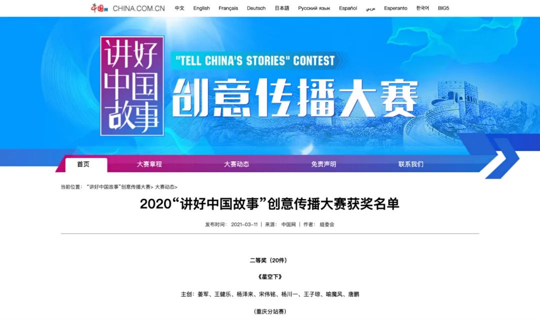 2020“讲好中国故事”创意传播大赛工作不日前结束,小二郎影片《星空下》(主创剪辑版)荣获国家级二等奖,书写了小二郎牛年新篇章。