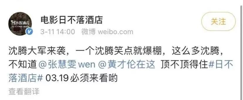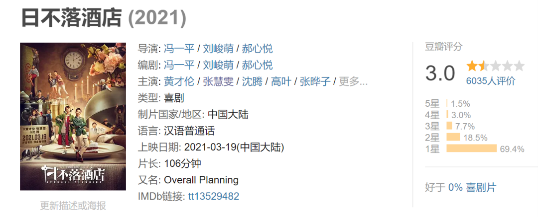 由开心麻花演员黄才伦、张慧雯及沈腾特别出演的奇幻喜剧《日不落酒店》在上周末上映第一天便在豆瓣获得了3.0分的口碑。