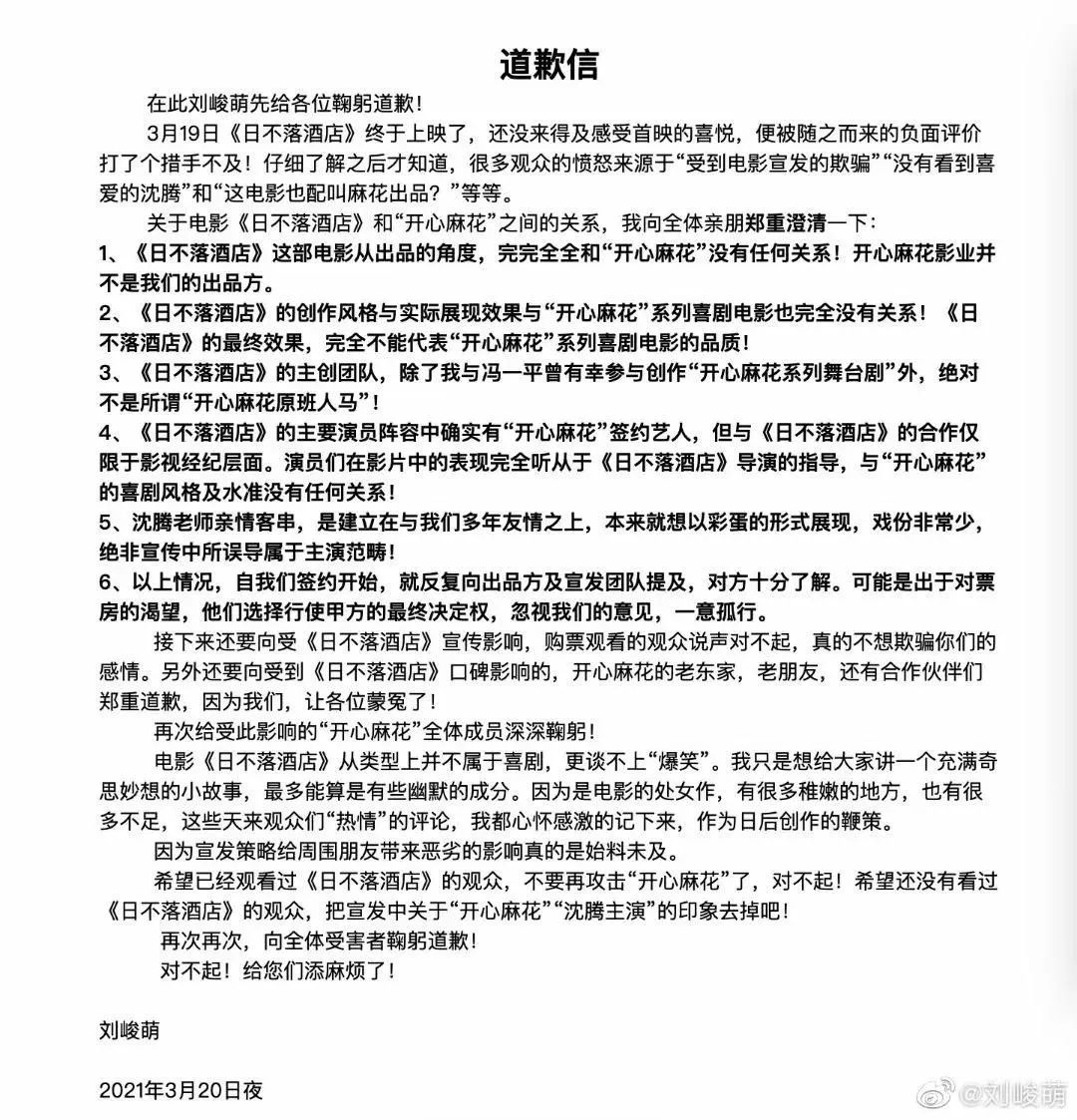 不知何故,后来导演又删了这封道歉信都是宣发的错?