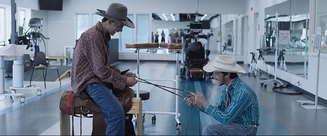 这些片段无不令人想起Chloé Zhao上一部影片《骑士》的开场,一个基调迥异却内涵相似的状态。在一个手持镜头中,我们看到了Brady的身体以及头上的伤,他服下药,点上烟,随后点开手机中的牛仔视频。《骑士》充满着一种如今在美国电影中难得一见的西部精神,但Chloé Zhao的西部不是约翰·福特的那个牛仔与赏金猎人全盛期的19世纪,也不是伊斯特伍德影片之中被召回的英雄主义,而是21世纪的拟像牛仔,被康复训练中心,手机屏幕包围,在影片的后半部分,Brady坐在医院的康复设施之中,模仿着骑马,在这一刻,他面对着自己的无能,不得不告别即将到来的Rodeo。