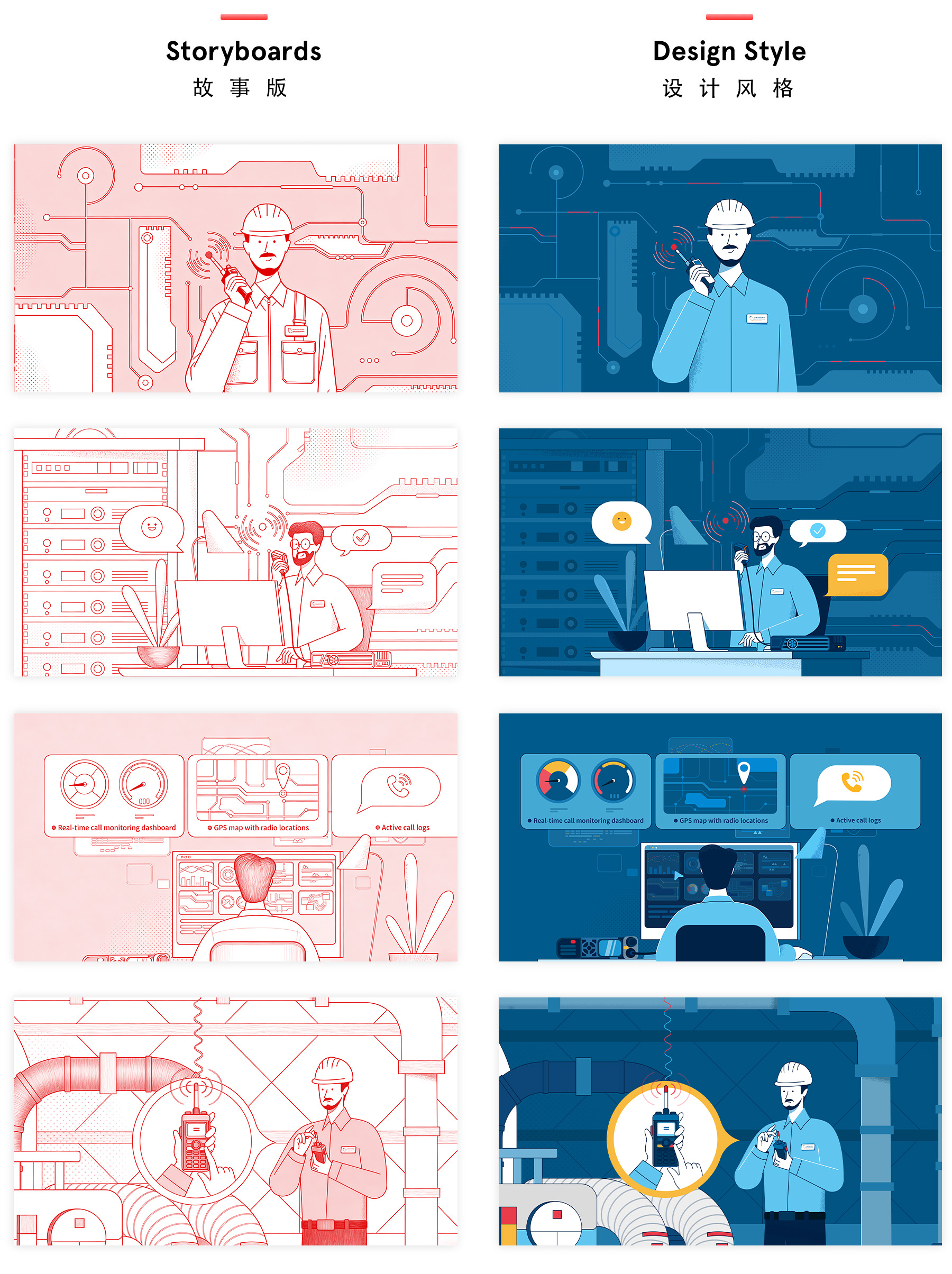 影片采用“岗位角色群像”的设定,把无线电通信的使用场景具象化:戴安全帽的现场工程师在厂房管线间排查设备,调度中心操作员在屏幕前实时监控与指挥联动,消防员则从驾驶舱到现场一路语音沟通。人物造型以干净的剪影与极简五官呈现,配合高识别度职业制服(蓝色偏工程/调度、黄色偏应急),让观众在快速剪辑中也能一眼读懂“谁在说话、在做什么”。